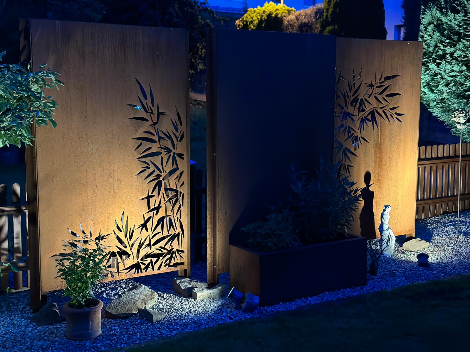 Zusätzlich sorgen stilvolle Sichtschutzelemente aus Cortenstahl sowie Holzzäune für Privatsphäre und ein stimmiges Gesamtbild.